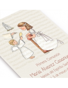 Dibujo de Primera Comunión. Niña con traje y angelito de la guarda.