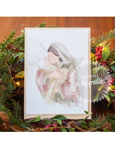 Christma con dibujo de la Virgen María abrazando al Niño Jesús. Incluye sobre.