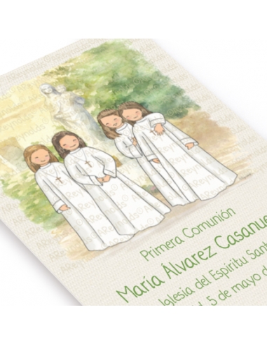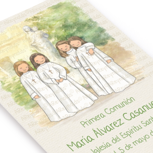 Dibujo de Primera Comunión. Niñas de túnica con la Virgen de El Pilar del patio del Colegio.