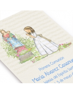 Dibujo de Primera Comunión. Niña de traje con angelito y corona de flores.