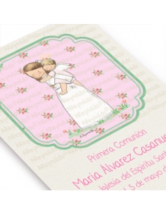 Dibujo de Primera Comunión. Niña de túnica con cinturón y Ángel de la guarda con Cruz grande de flores.