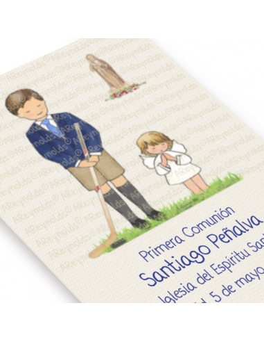 Dibujo de Primera Comunión. Niño con angelito, Stick de Hockey y Virgen.