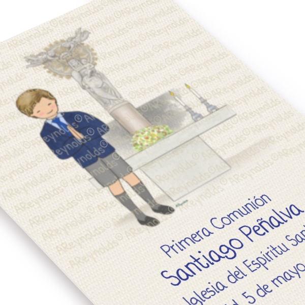 Dibujo de Primera Comunión. Niño de traje y Capilla Colegio El Pilar.