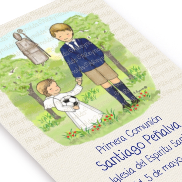 Dibujo de Primera Comunión. 3 niños con chaqueta azul y cruz.