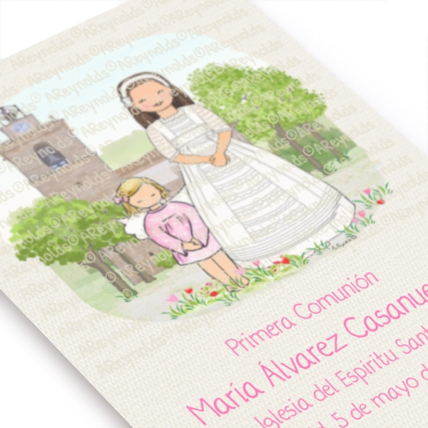 Dibujo de Primera Comunión. Niña y angelito rosa con Iglesia de fondo.