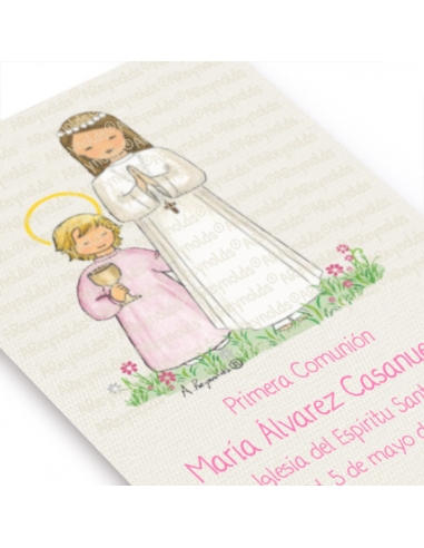 Dibujo de Primera Comunión. Niña con túnica y ángel de la guarda.