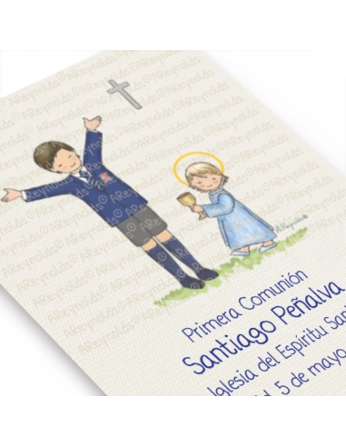Dibujo de Primera Comunión. Niño con uniforme del colegio Everest y Jesusito.