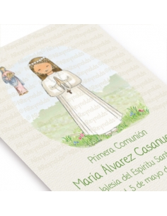 Dibujo de Primera Comunión. Niña de túnica con Virgen Mater Salvatoris.